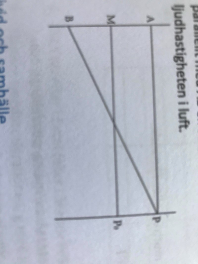 I punkterna A och B finns två små likadana högtalare på 60 cm avstånd från varandra. Högtalarna svänger i fas och alstrar varsin ton med frekvensen 1000 Hz. I en punkt P0 på mittpunktsnormalen till AB finns en mikrofon placerad. Mikrofonen är kopplad till en förstärkare som mäter ljudstyrkan. Avståndet från P0 till M är 100 cm. Då mikrofonen flyttas parallellt med AB en sträcka 30 cm från P0 till P minskar ljudstyrkan till ett minimum. Beräkna ljudhastigheten i luft.