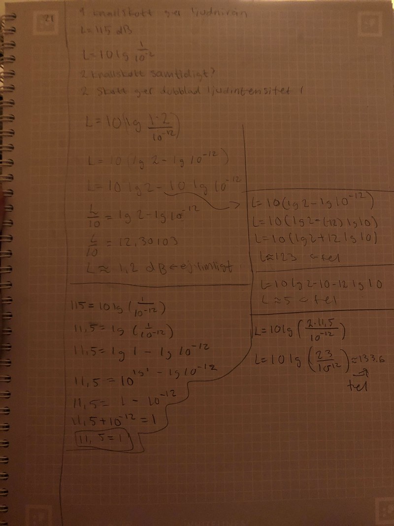 Beräkna ljudnivån för två samtidiga knallskott? Test 3 uppgift 21 liber ma2c