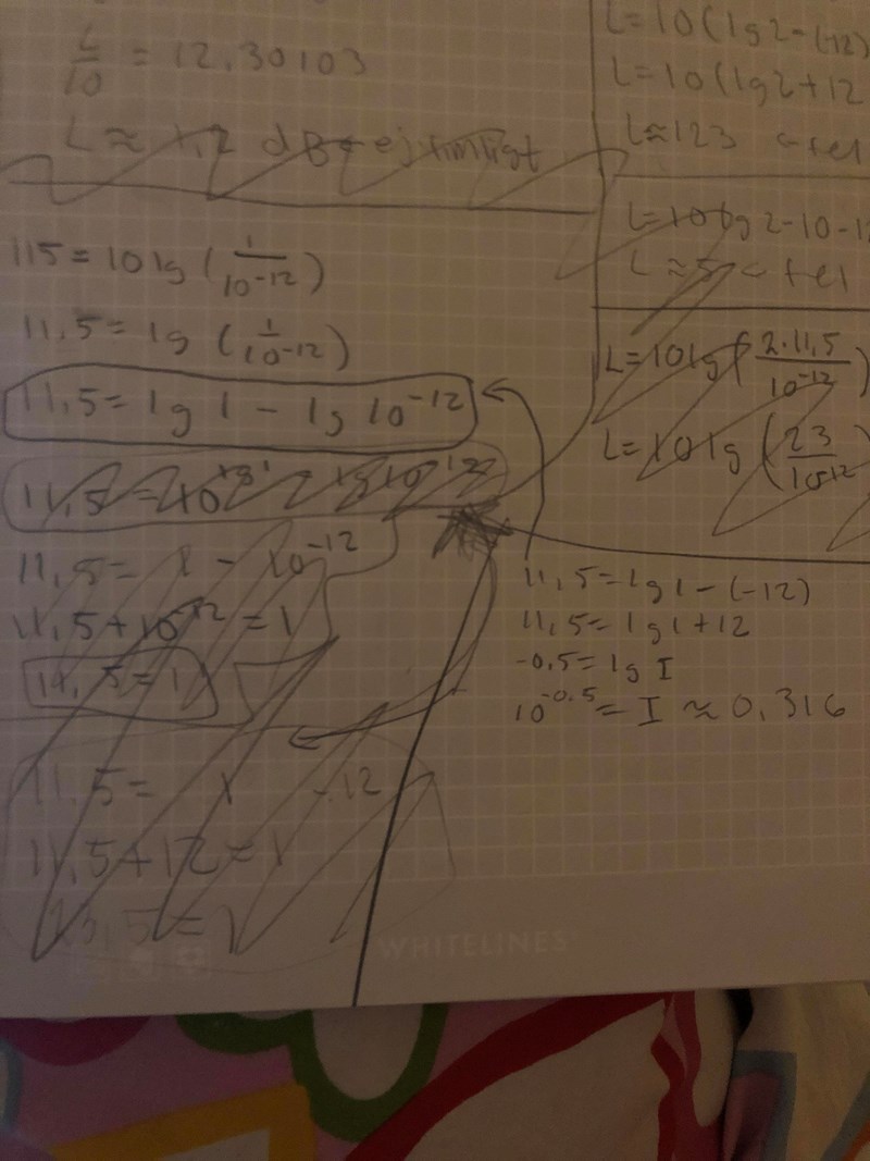 hör är mina försök och jag är medveten om att jag misstog I för en etta i mina tre första försök men sedan löser jag vad I är (lägst ned till vänster) och skriver sedan in de i ekvationen(den tredje uträkningen av de till höger) men de blir ändå fel. Svaret ska bli 118dB. Här är mina lösningar iallafall: