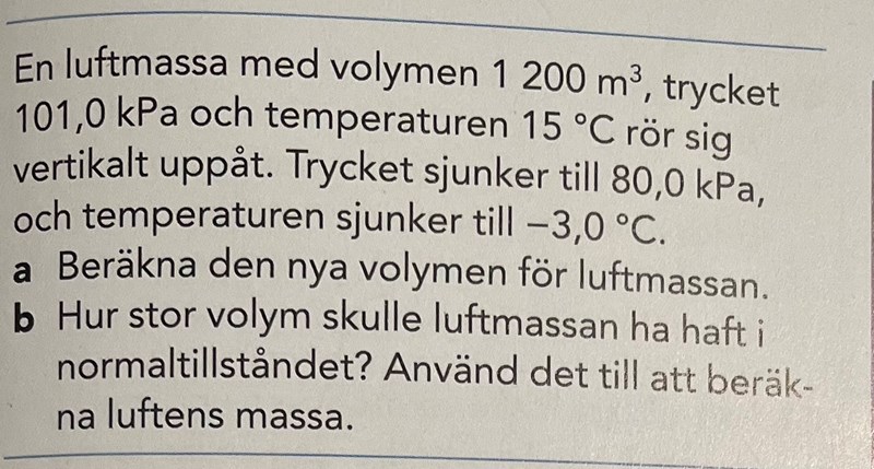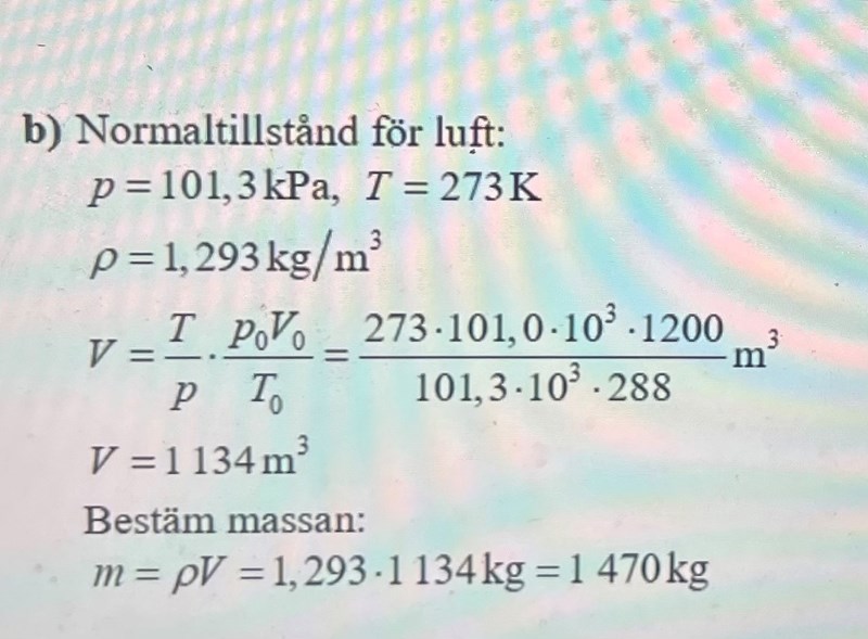 Jag håller på med uppgift b som du kan se nedan. Nedan kan du även se lösningsförslaget. Jag förstår inte riktigt varför p0V0/T0 multipliceras med T/P för att ta reda på volymen? Jag skulle uppskatta om någon kunde förklara detta för mig!