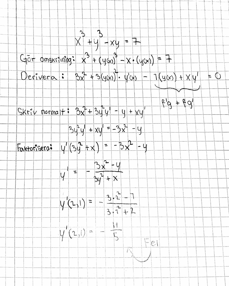 Beräkna lutningen i kurvan x^3 + y^3 - xy =7