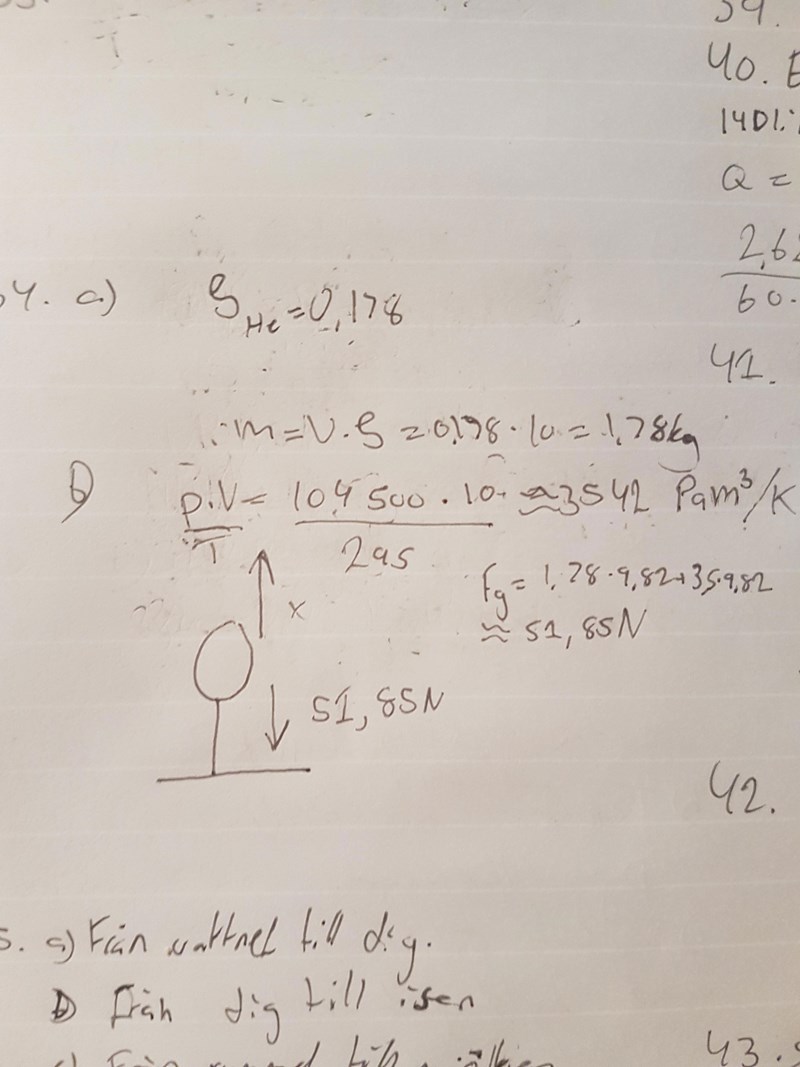 Jag har lite problem med en uppgift då jag inte vet hur jag ska omvandla tryck och volym i den ideala gaslagen till lyftkraft.