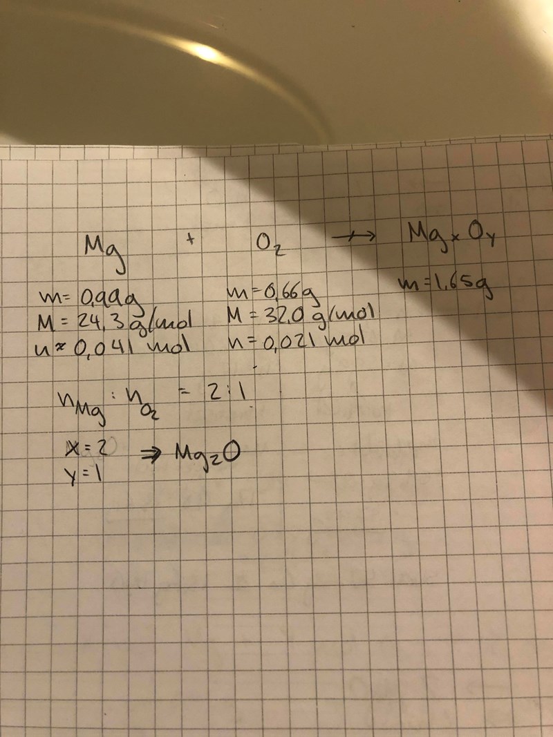 Och uppgiften är att räkna ut från ett experiment den empiriska formeln, d.v.s. X mol Mg + Y mol O2 => Z mol produkt.