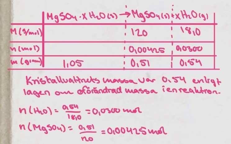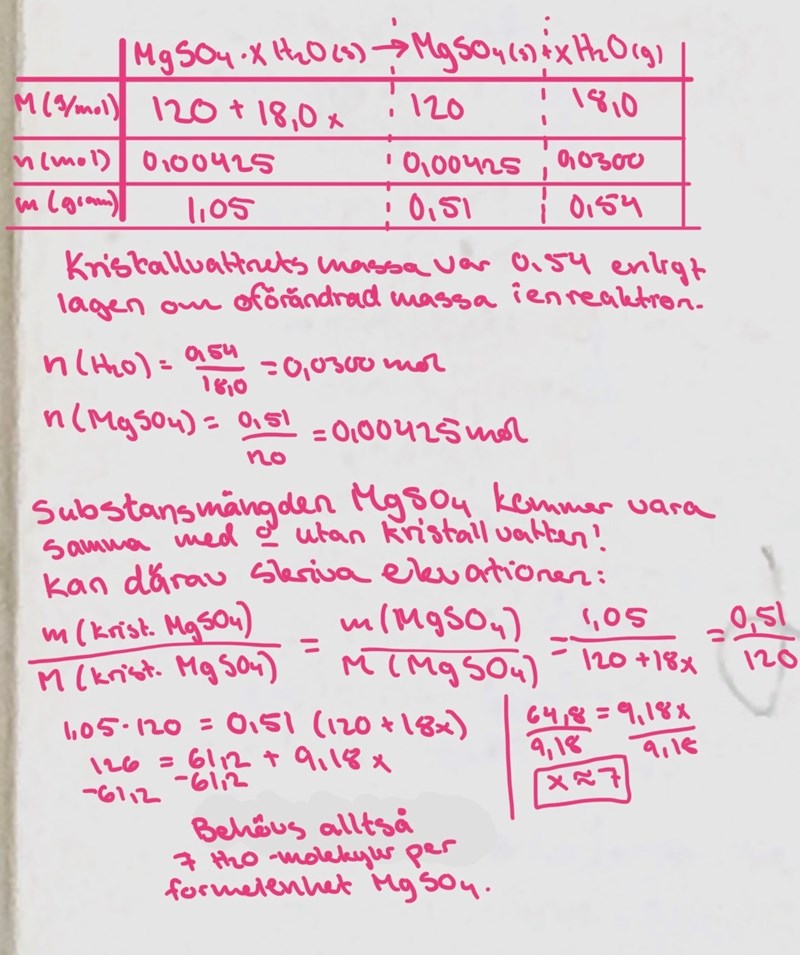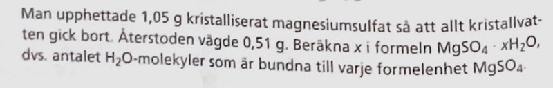 Du har allt utom molmassan för det kristalliserade magnesiumsulfatet. Du vet dock att den är 120 + 18x, där x förstås är antal vatten:
