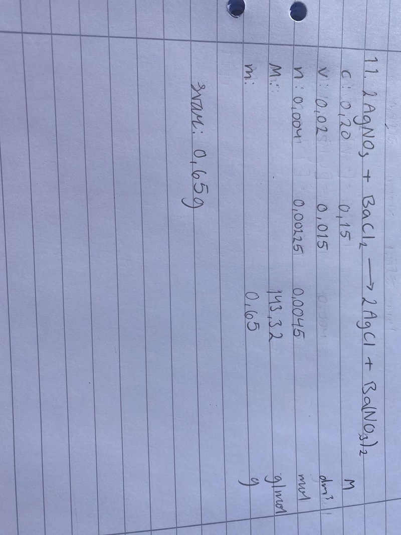 ”Hur stor massa har den fällning som uppkommer då man blandar 20cm^3, 0.20M silvernitrat med 15cm^3, 0.15M bariumklorid?”