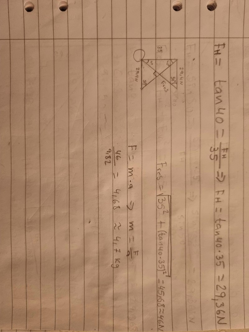 "En boll hänger i två snören. Hur stor är bollens massa om kraften i det vänstra snöret är 35 N?"
