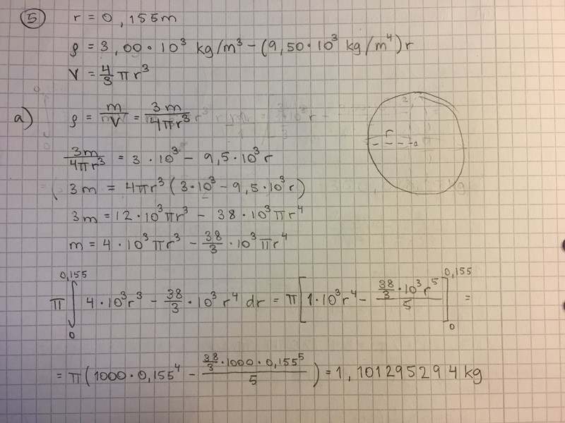 och sedan få fram massan genom att integrera densiteten över klotets volym i sfäriska koordinater. När integralen är klar skulle jag sätta in numeriska värden.
