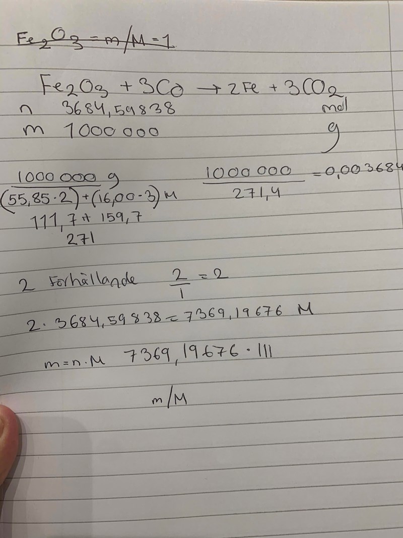 jag tog massa för Fe2O3 som är 1 ton och dividera med Molmassa och fick 0,0036846