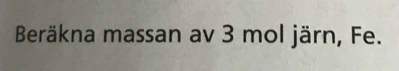 Jag har fastnat vid denna uppgift. Jag vet redan att man ska använda sig av formeln m = M x n där man kan använda molmassan genom att kolla på atommassan, men jag vet ej vad substansmängden är och behöver veta det för att kunna lösa uppgiften?