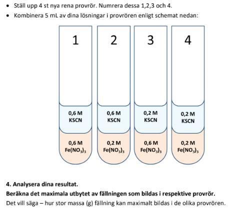 Smaragdalena skrev:Det bildas lika mycket fällning i provrör 3 och provrör 4, eftersom båda innehåller lika mycket tiocyanatjoner, som är begränsande.
