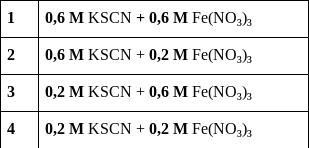 Det bildas lika mycket fällning i provrör 3 och provrör 4, eftersom båda innehåller lika mycket tiocyanatjoner, som är begränsande.