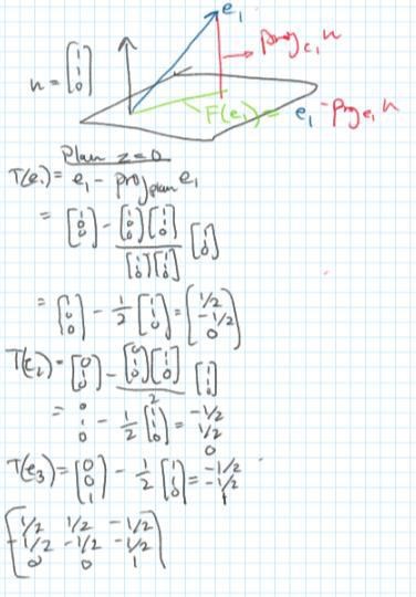 hej! jag har en uppgift där jag skall hitta matrisen för den ortogonala projektionen på planet z=0. jag har använt mig av hur standardvektorerna beter sig dvs F(e1) osv. men facit säger det ska va