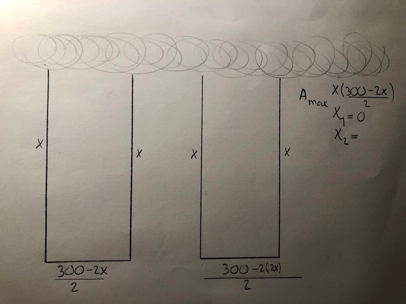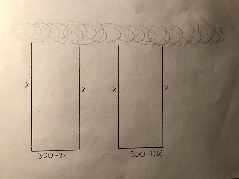 Hej. Jag har en uppgift som jag sett någonstans och vill lösa den nu men vill ta lite hjälp här. Dessa två områdena ska föreställa staket och en sida behöver jag ej lägga staket då det är hav där och därför lägger jag staket på endast 3 sidor i vardera område. Jag har 300 meter rep och vad ska x ha för värde för att dessa två områden ska få en maximal yta.