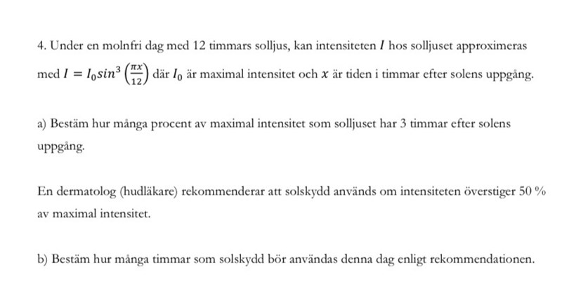 Ok, jag får fram att . Frågan är bestäm hur många procent av maximal intensitet som solljuset har efter 3 timmar. Jag förstår fortfarande inte hur jag ska gå tillväga för att svara på frågan. Är svaret 3%.