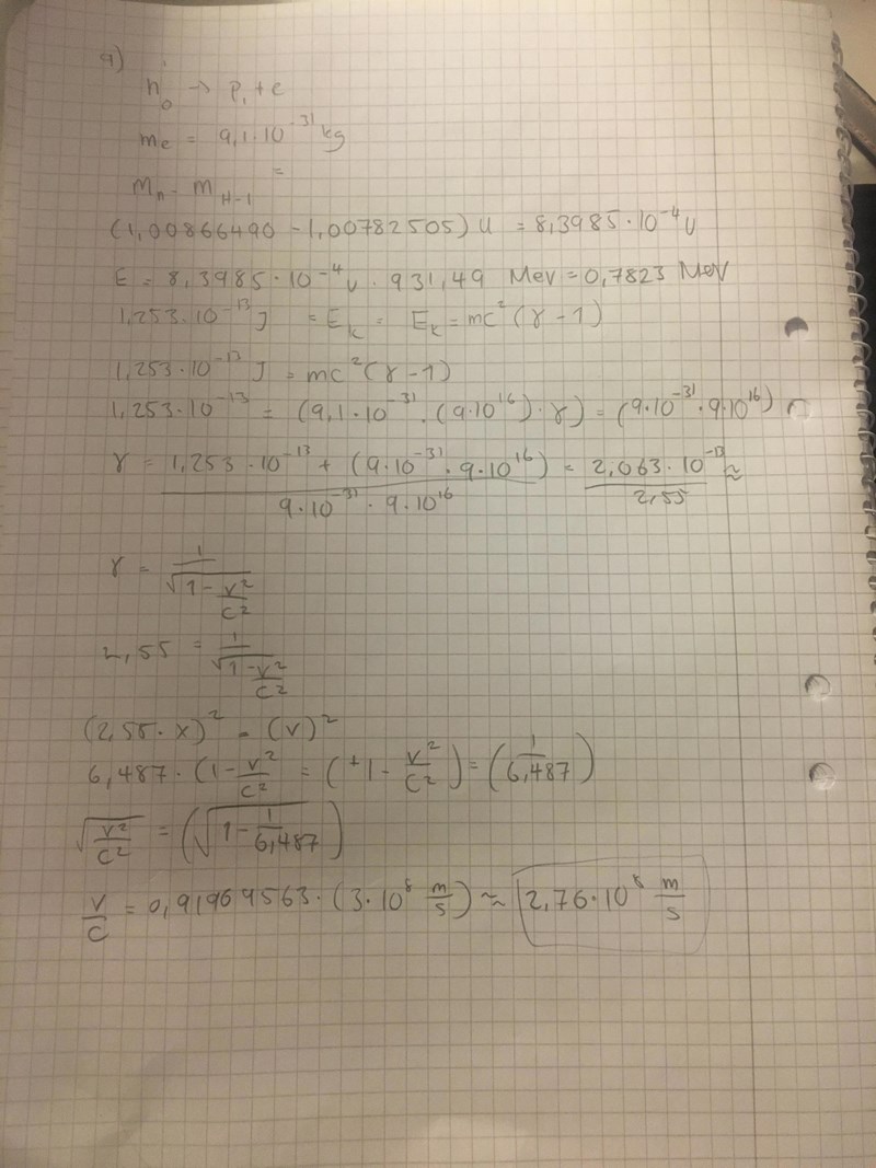 fråga: beräkna maximala hastigheten hos den elektron som bildas då en neutron sönderfaller till en proton och elektron. Bortse från neutronens ursprungliga hastighet och antag att all sönderfallsenergi återfinns som rörelseenergi hos elektronen.