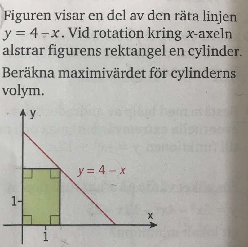 Hej, följande uppgift finns i min mattebok och jag vet inte hur jag ska komma igång med den. Jag tänker mig att radien blir y-koordinaten och höjden är x-koordinaten om rektangeln roterar kring x-axeln. Tänker jag rätt?