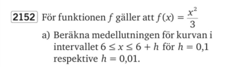 Dels beräkna f(6,1) och f(6), beräkna differensen och dela med 0,1, dels beräkna f(6,01) och f(6), beräkna differensen och dela med 0,01.