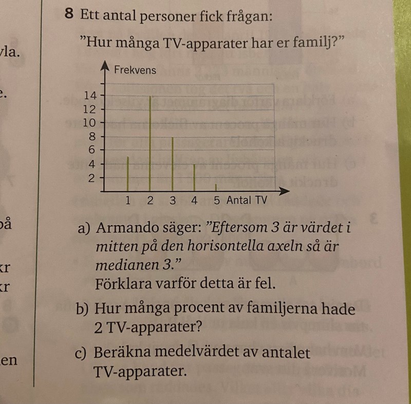 Hur många TV-apparater finns det totalt? Sedan hur många personer svarade? Första stapeln exempelvis säger att 5 personer hade 1 TV-apparat, andra säger att 14 personer hade 2 TV-apparater (28 totalt) osv.