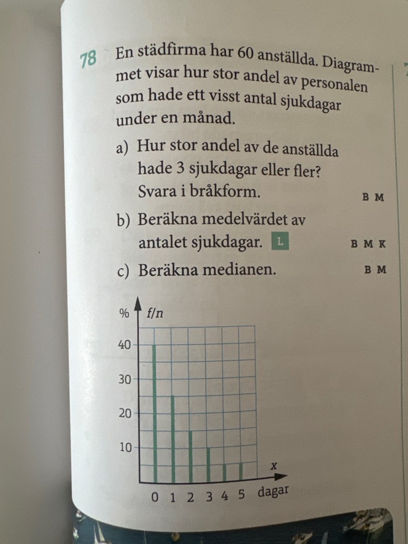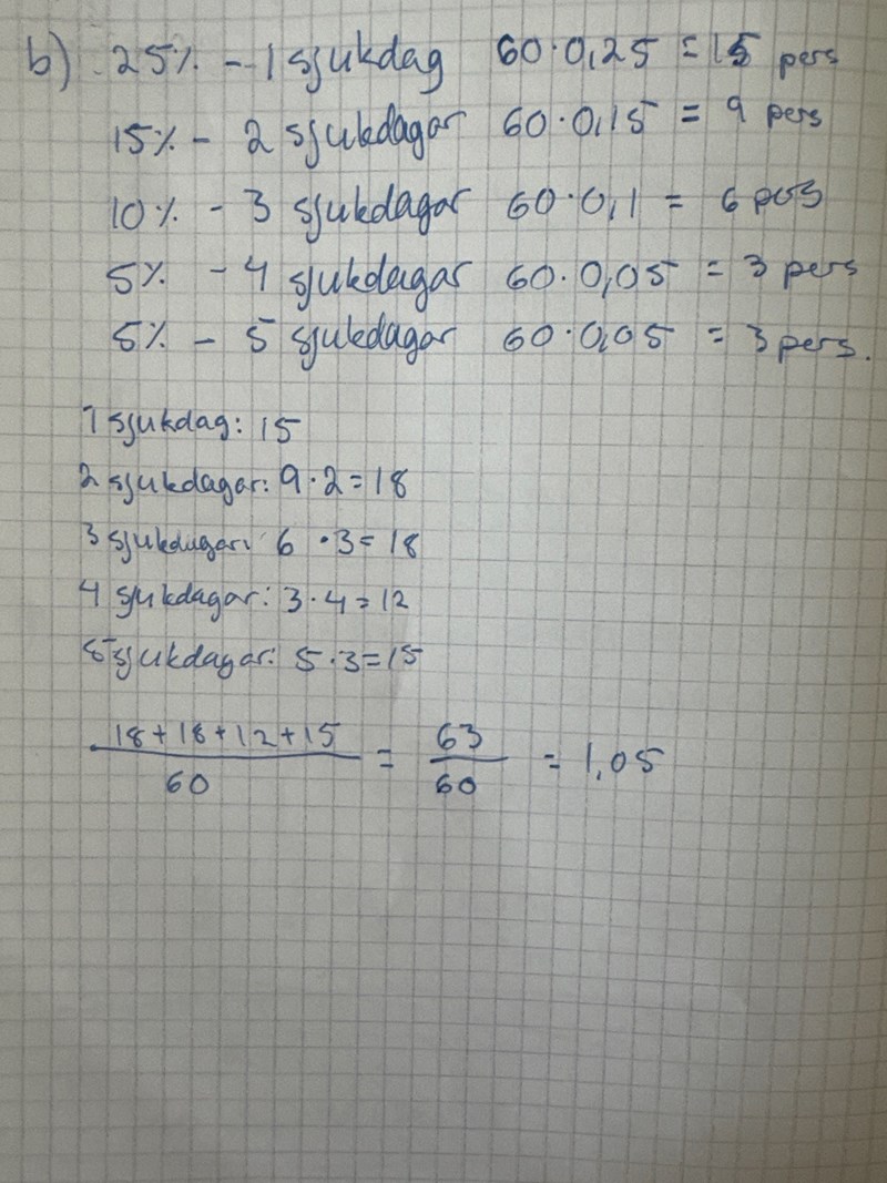 Hur menar du? för det finns inget att multiplicera 15 med, det var 15 pers som hade en sjukdag. alltså hade de sammanlagt 15 sjukdagar. Menar du i summan i täljaren i divisionen? för 18+18+12+15 =63