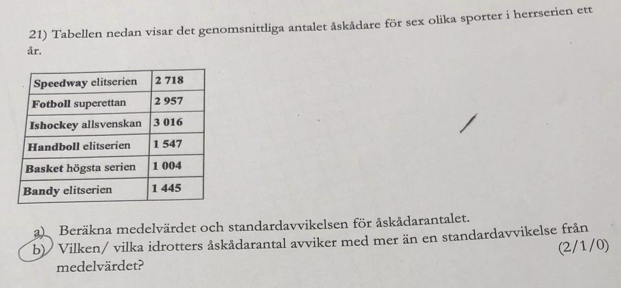 Medelvärdet är 2 114. Standardavvikelsen är 805. En standardavvikelse över medelvärdet är 2 919. En standardavvikelse under medelvärdet är 1 309. Det finns två sporter som har fler än 2 919 åskådare i genomsnitt och en sport som har mindre än 1309 i genomsnitt. Vilka sporter är det?