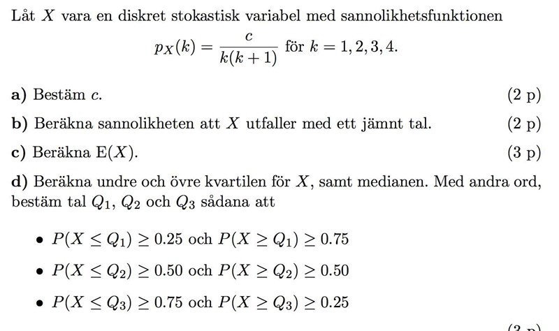 Beräkna median, övre och undre kvartil för diskret slumpvariabel