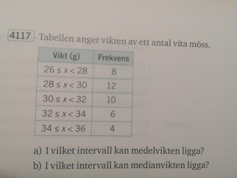 Calle_K skrev:Det är totalt 20 möss för x<30 och totalt 20 möss för x>=30. Därav kommer medianen vara medelvärdet av 2 massor, varav en ligger i intervallet 28<=x<30 och en ligger i intervallet 30<=x<32. Detta medelvärde kommer som lägst vara 29 (om massorna är 28 och 30) och som högst precis under 31 (om massorna är precis under 30 och 32). Därav får vi intervallet 29<=x<31