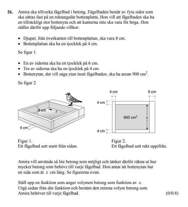 Hmmm, tror inte riktigt jag förstår. Volymen av hela fågelboet blir väl (x-8)*(y-10) eftersom att sidorna sticker ut 6 cm och 4 cm. Eller jag kanske tänker helt fel.