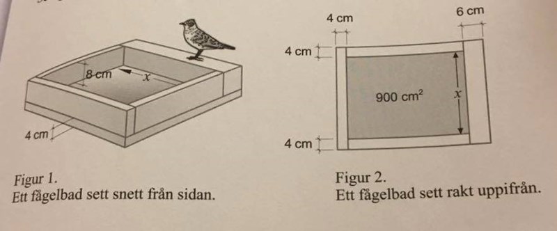 smaragdalena skrev :Du skall alltså ha en bottenplatta, som är 4 cm tjock och har längden (x + 4 + 6) cm och bredden (y + 4 + 4) och fyra kantbitar, varav två är lika (fast dem får du skriva upp själv).