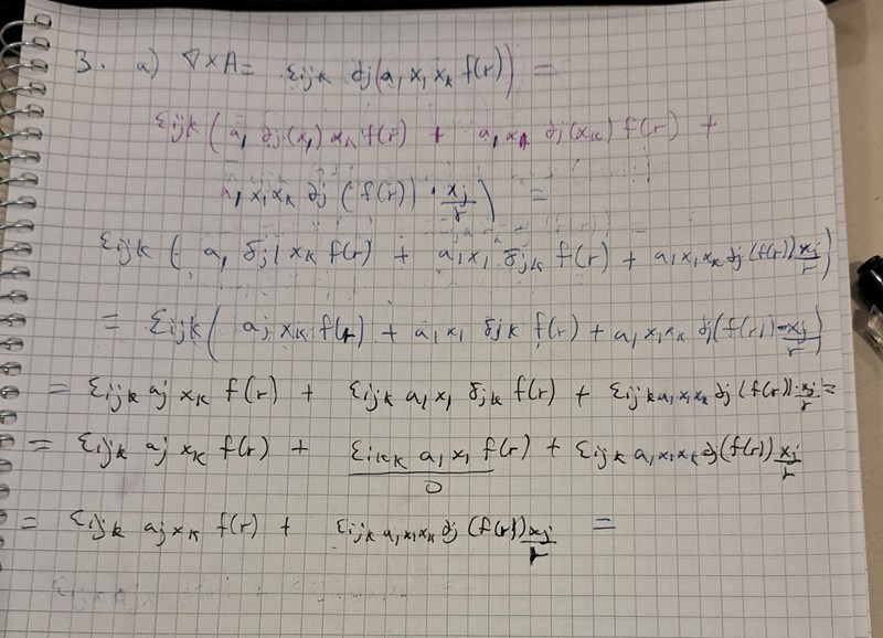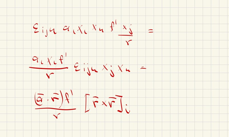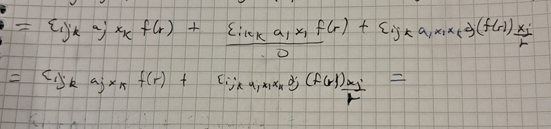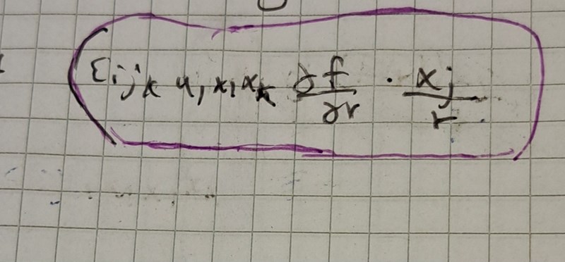 Något som även förvirrar mig är när man har först xk kryss df/dr*(xj/r).  Jag vet inte vad xk , xj och r är för något så att allt blir 0. Det är många variabler att hålla koll på och alla betyder olika saker.
