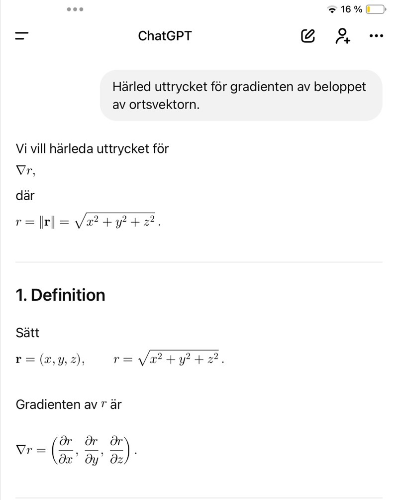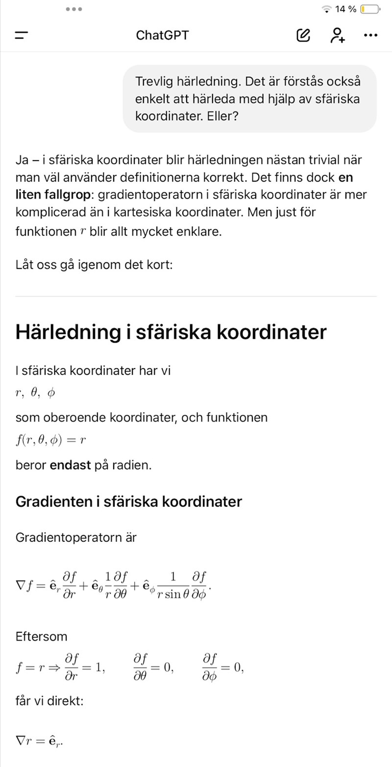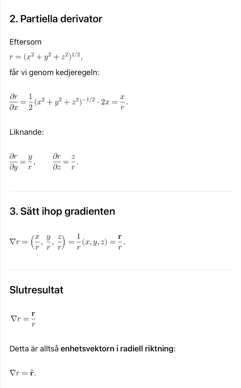 Jag tolkar som att r är beloppet av ortsvektorn , så när man deriverar f(r) så är det som att derivera f(sqrt(x1^2+x^2+x3^2)) map på r (beloppet) och mha kedjeregeln får man ju f'(r)*x1/r , f'(r)*x2/r eller f'(r)*x3/r  beroende på om vill derivera x1 , x2 eller x3. Det chat säger förstår jag.