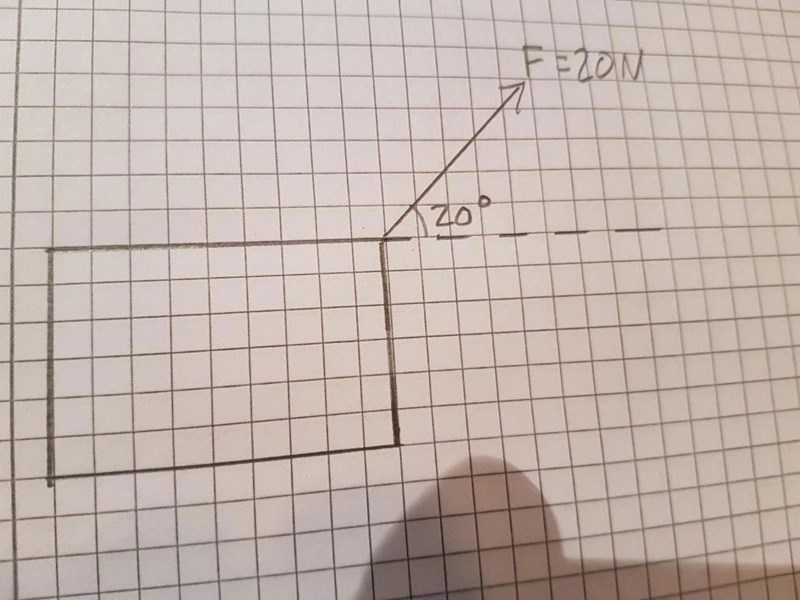 Du komposantuppdelar F=20N-kraften i en horistonell (höger) komponent och en vertikal(upp) komponent. Den vertikala kom