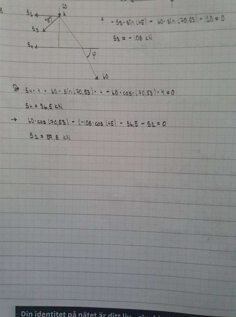 Den horisontella kraftjämvikten är inkorrekt. Du fick fram att s4 var positiv vilket betyder att den har riktning vänster enligt figur men du anger den ändå som positiv till höger i kraftjämvikten.