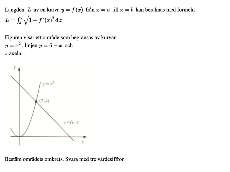 Jag får svaret till 16,13 iaf, kan va fel, men mitt första lösningsförslag visar omkretsen som begränsas mot y-axeln och när jag läser uppgiften igen är det ju faktiskt fel område, det är ju kurvan L =x^2 linjen y=6-x och x-axeln som omkretsen gäller! Nån fler som tolkar det som jag?