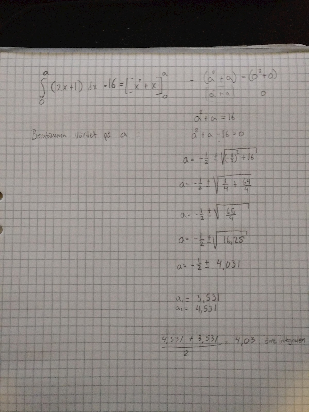 Ett annat svar är att , vilket motsvarar att den i blått inringade arean minus den i rltt inringade arean är lika med 16 a e.