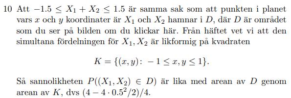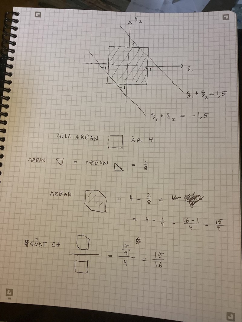 Hm jag vet inte jag har gjort den här uppgiften för 1-2 månader sedan så var nog så jag kom ihåg figuren och tänkte då att de tänker att både -1,5<xi1<1,5 och -1,5<xi2<1,5. Eller det är så jag hade uppfattat det och så jag tänkte nu. Dock verkar din lösning mycket mer tydlig och logisk så tror nog den stämmer bättre:)