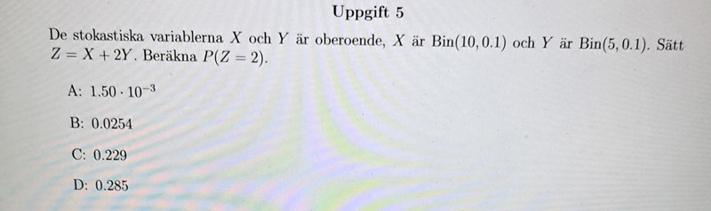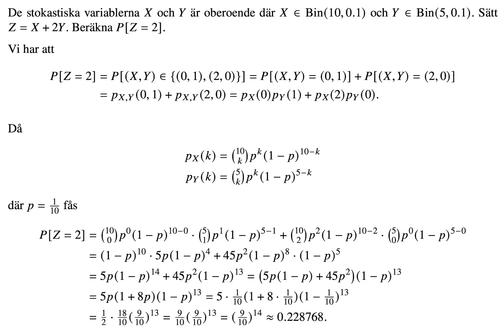 Dvs P(Z=2)=P(X=2,Y=0) + P(X=0,Y=1) oberoendet medför att P(Z=2)= P(X=2)P(Y=0)+P(X=0)P(Y=1)