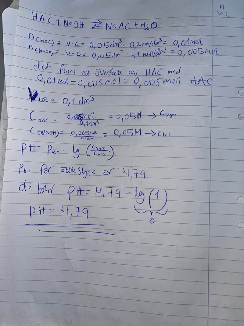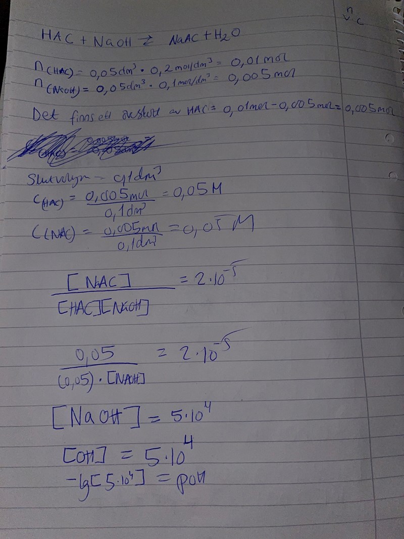 Beräkna pH i den lösning som man får genom att blanda 50 cm3 0,20 mol/dm3 HAc med 50 cm3 0,10 mol/dm3 NaOH (obs! natriumhydroxid). Ka(HAc) = 2,0 · 10^-5 mol/dm3