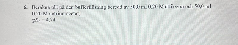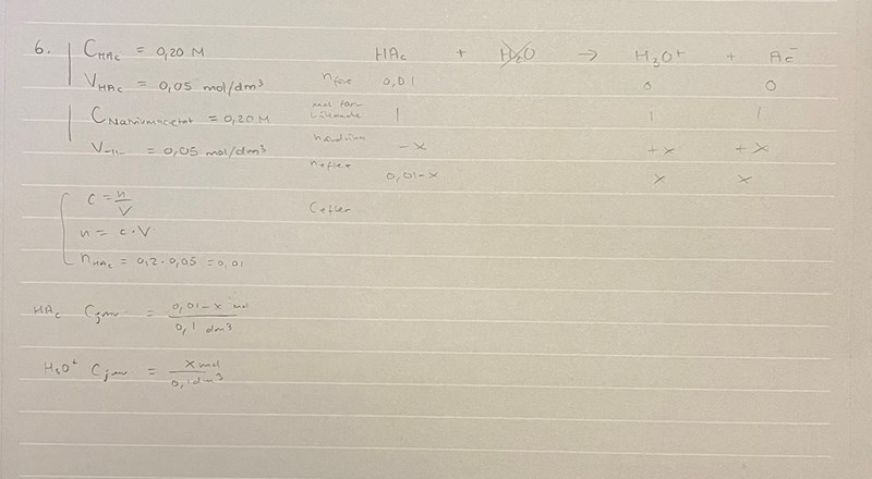 Jag håller på med denna uppgift som du kan se nedan. Jag förstår inte riktigt hur jag ska gå tillväga för att lösa den. Så här började jag lösa den. Det jag ville ta reda på var koncentrationen H3O+ så att jag kan använda mig av regeln pH = -lg[H3O+]. Jag tänkte att man också kan använda sig av regeln pH = pKa + lg([bas]/[syra]). Då behöver jag först ta reda på vad basen och syran är. Jag tror basen är Ac- och syran H3O+. Så för att använda den formeln måste jag veta C för Ac- och H3O+. Jag försökte kolla på lösningsförslaget i facit men förstod inte alls vad dem har gjort (se nedan). Varför har de dividerat 0,2 med 2, och vart har de fått 0,2 ifrån? Vad är det ens 0,2/2 står för? Volymen? Subtansmängden? Koncentrationen? Vad menar dem med att totalvolymen har dubblats? Sen så undrar jag varför natriumacetat inte är med i formeln?