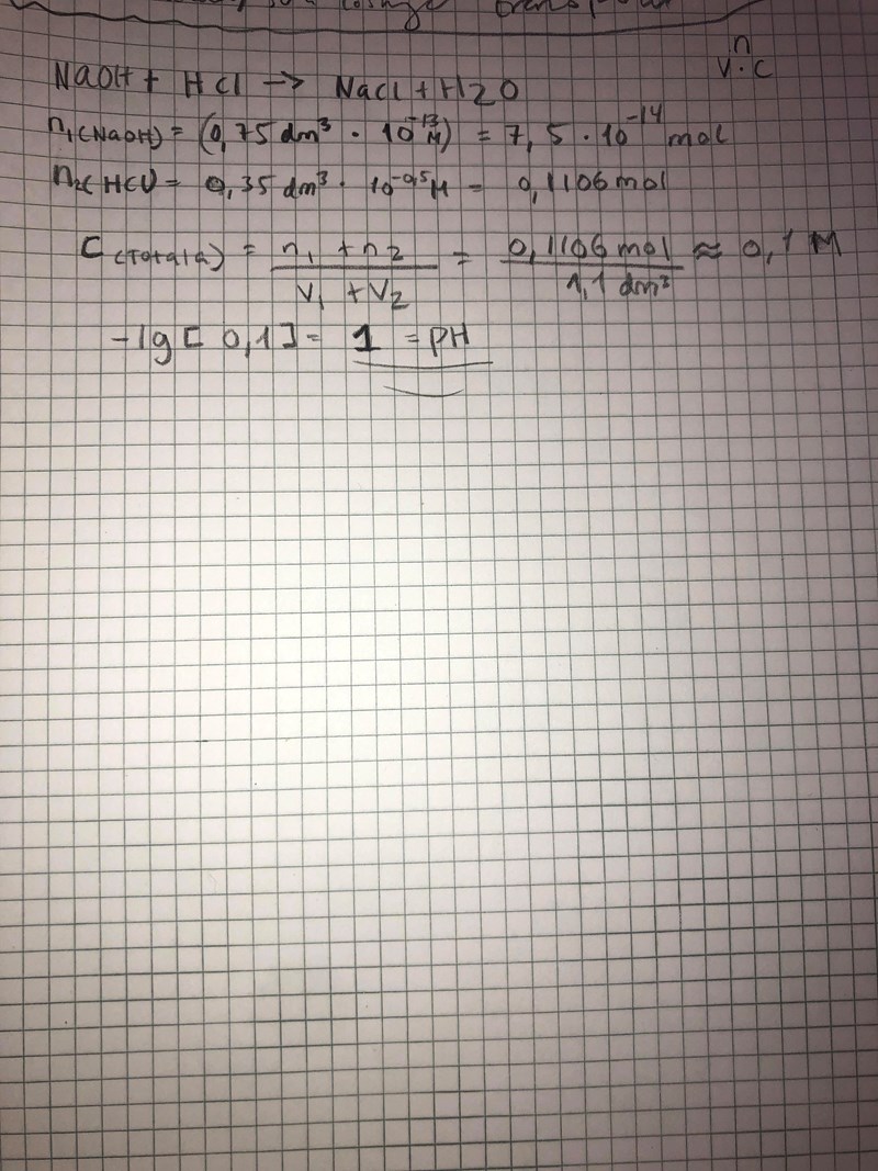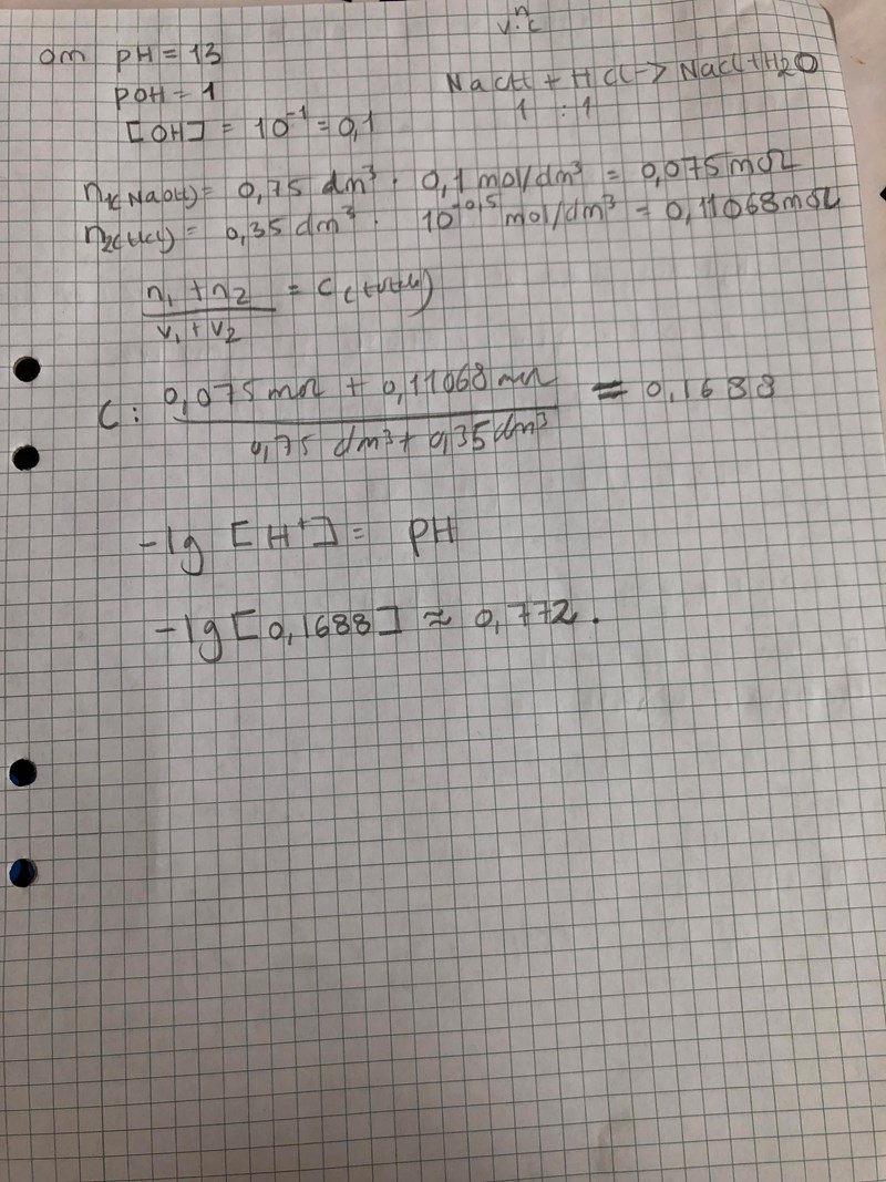 Du blandar 750 ml natriumhydroxid (pH = 13,0) och 350 ml saltsyra (pH = 0,5). Vilket pH-värde får din blandning?