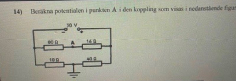 Du har räknat ut att A har 25V högre potential än punkten på andra sidan om 80 ohmsmotståndet. Vilken potential har den punkten?