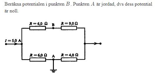Potentialen i delningspunkten (den vänstra) räknar vi ut genom att gå från punkten A (0 V) åt vänster mot strömmen genom 6 ohm. Då stiger potentialen och vi får U = 6*3 = 18 V