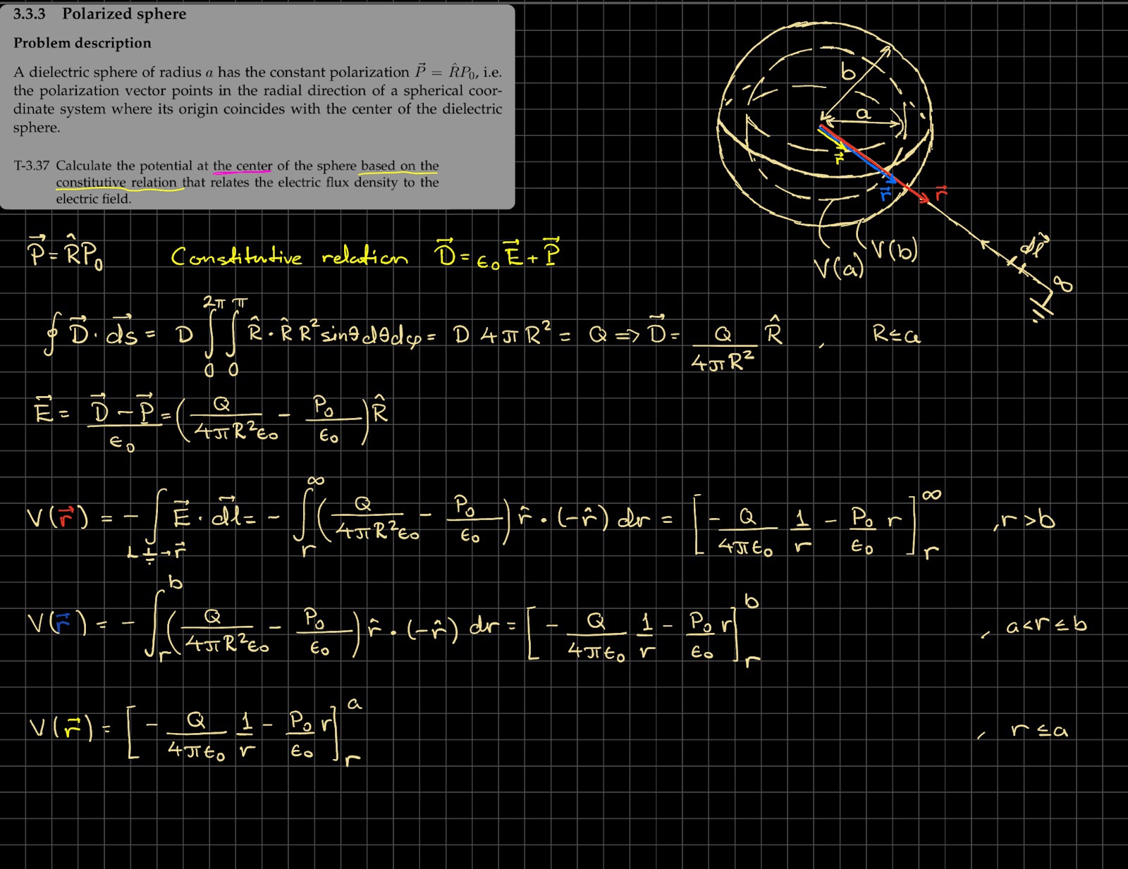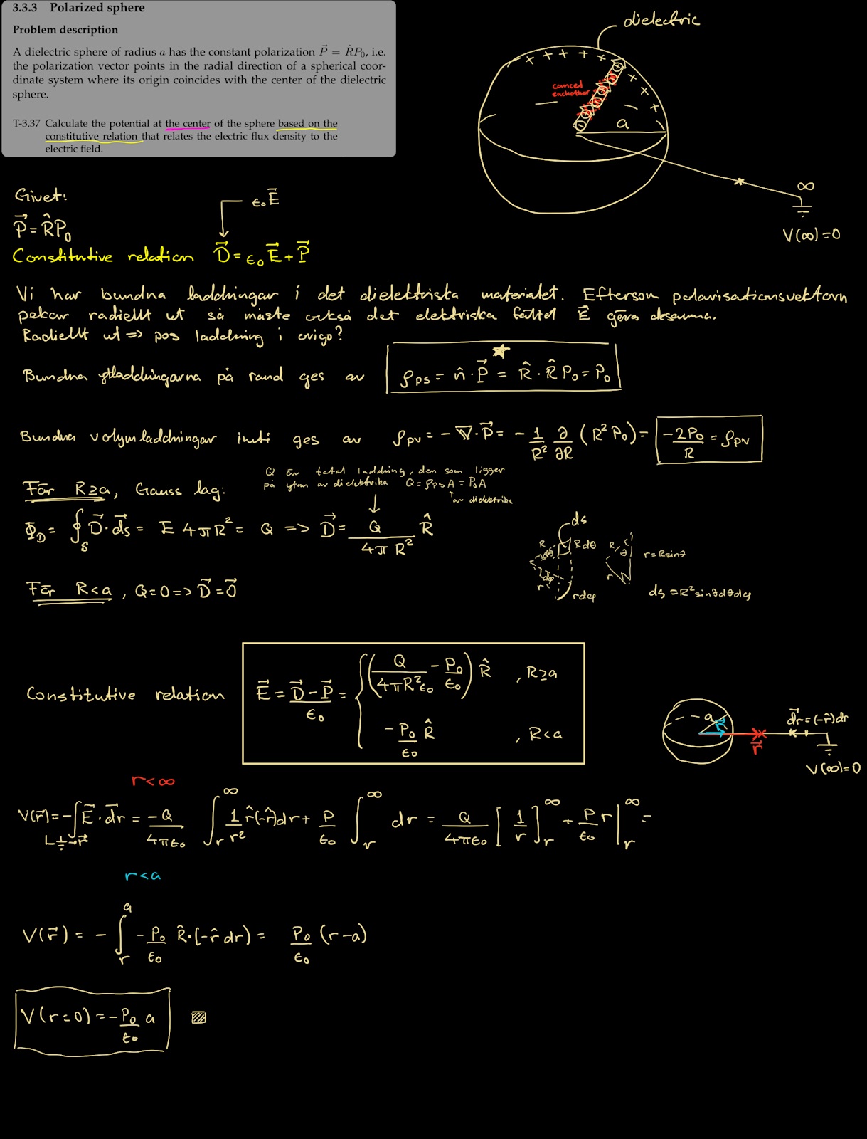 Min plan var följande, jag löser ut E ur constitutive relation då jag vet att potentialen beror på E. Sen tar jag fram D med hjälp av Gauss. Sen använder jag mig helt enkelt av definitionen för att ta fram potentialen för r=0.