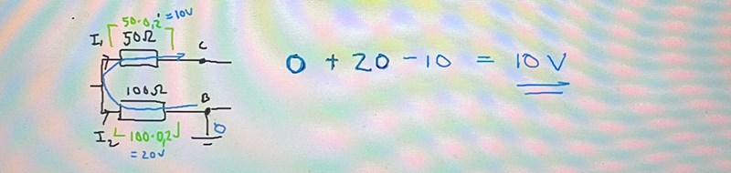 Jag håller på med denna uppgift som du kan se nedan. Nedan kan du även se lösningsförslaget från facit. När jag löste uppgiften gjorde jag precis som facit gjorde förutom att jag i sista steget gjorde 0V + 20V + 10V istället för - 10V. Jag undrar varför man ska ta minus - 10V istället för + 10V? Har det någonting med strömmens riktning att göra?