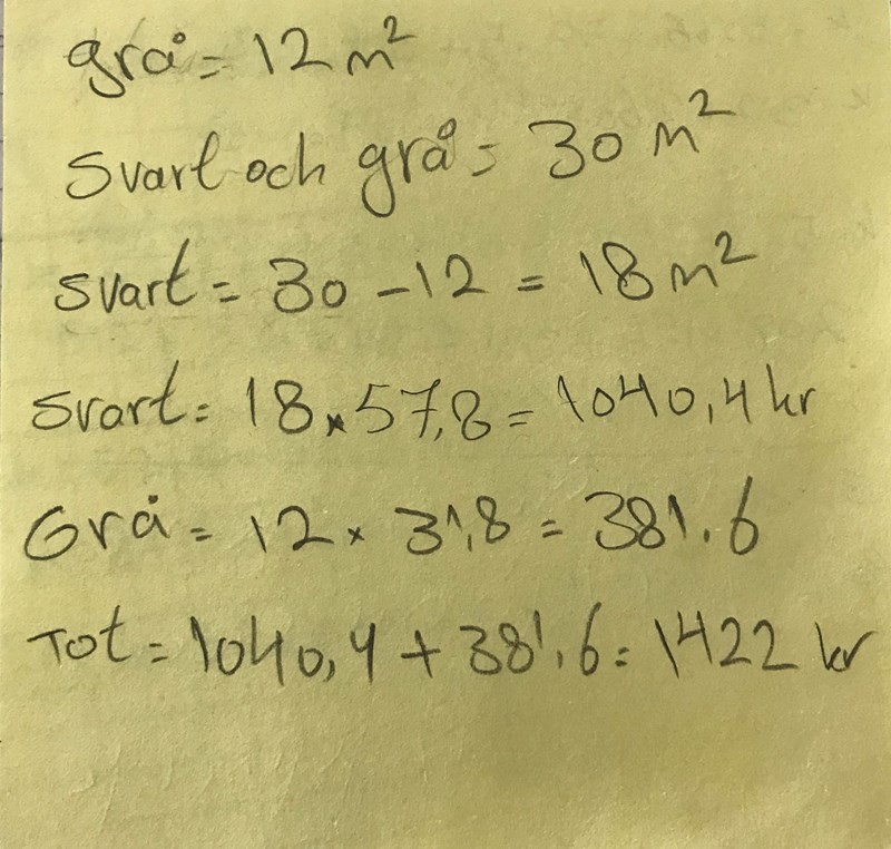(Du har visserligen nu utgått från att varje platta är 1 m2 vilket inte var hämtat från uppgiften, men uträkningarna stämmer)