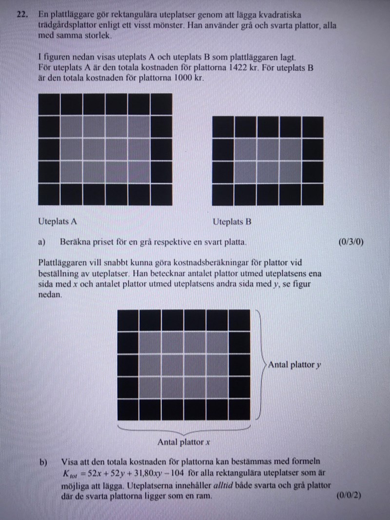 Jag förstår inte hur du har tänkt på b)-uppgiften men ett lämpligt förstasteg vore att sätta upp ett uttryck för hur många svarta respektive hur många grå plattor en uteplats som är x*y stor kräver. Efter att du har skapat dessa två uttryck kan du multiplicera dessa med respektive kostnad och se om det liknar uttrycket.