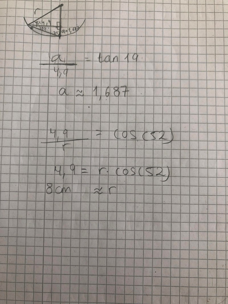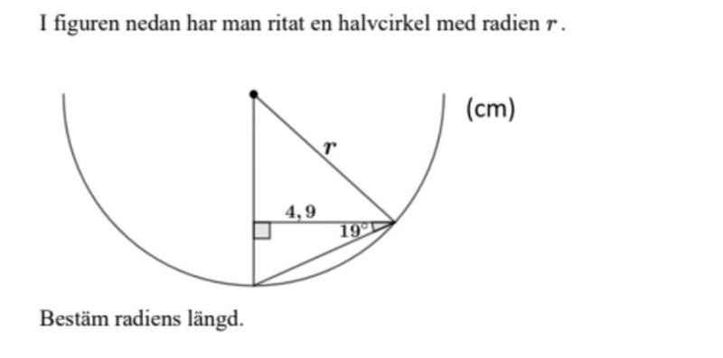 a behövde du inte ens räkna ut, utan det räcker att konstatera att vinkeln mellan sträckan på 4.9 cm och radien är 52°.