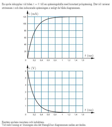 Strömmen genom spolen är 0 före t=0 (eftersom kretsen inte är sluten). Vid t=0 kopplas spolen in. Strömmen i kretsen vill då börja flyta, men som jag beskrev så kommer en spänning e då att induceras över induktansen, vilken kommer att motverka strömändringen i kretsen. Genom att titta i graferna vid t=0 så ser man att i=0mA och e=6V. Utav det kan man lista ut att U måste vara 6V, eller hur? (Eftersom ingen ström flyter genom R vid det tillfället så måste hela spänningsfallet U kompenseras av e). I uppgifttexten står att U är konstant, det betyder att U=6V även efter lång tid, när spolen ser ut som en ren resistans.