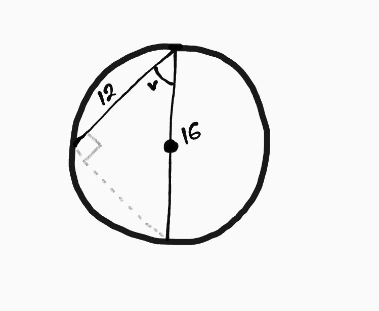 Vinkelbenen till en randvinkel utgörs av en korda och cirkelns diameter. Bestäm vinkelns storlek då kordan är 12 cm och vinkelns radie är 8 cm.