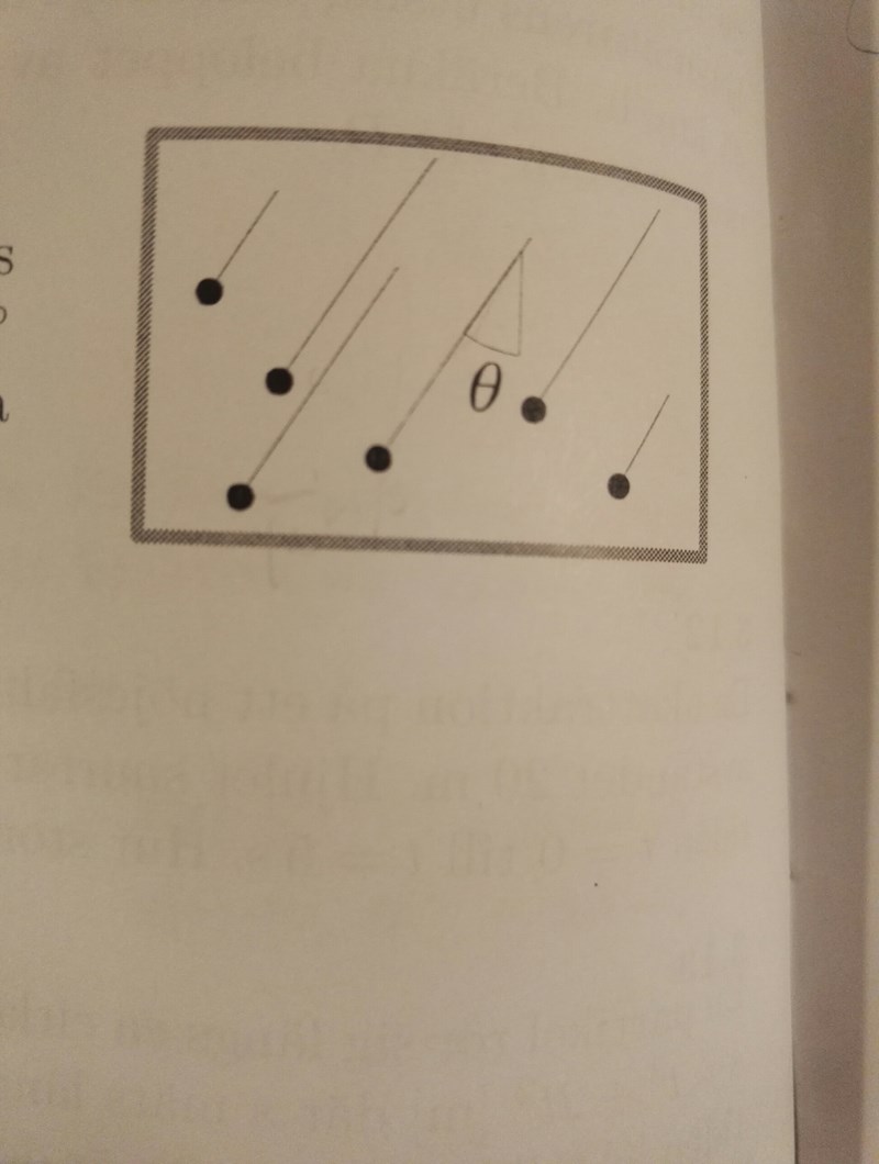 "En regnig dag gör en tågpassagerare följande observation. Då tåget kör med konstant hastighet 15 m/s bilder spåren efter regndropparna på rutan vinkeln med lodlinjen. Då tåget har stannat blir . Beräkna regndropparnas fast (relativt en stillastående observatör)."