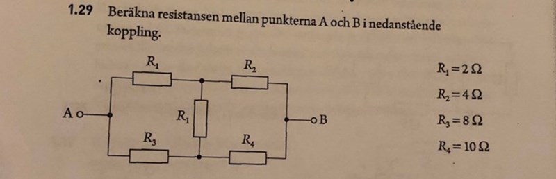Hej! Kan någon förklara hur jag ska tänka här? Jag ser att r1 och r3 är parallelkopplade, r2 och r4 är parallelkopplade. Jag har räknat ut rtot för r1 och r2. Och rtot för r2 och r4.. Hur gör jag sen? Ska jag addera dessa rtot?